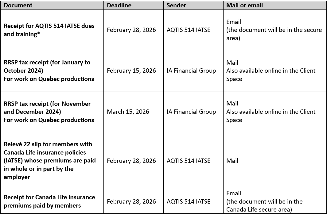 *Note that the 2.5% union dues paid by technicians who worked on U.S. productions will appear on the T4 and Relevé 1 slips issued by the employer (the producers).